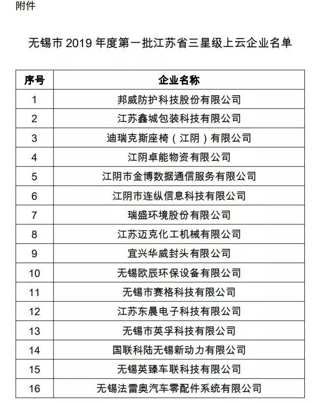 邦威防护入围无锡市2019年度第一批江苏省三星级上云企业
